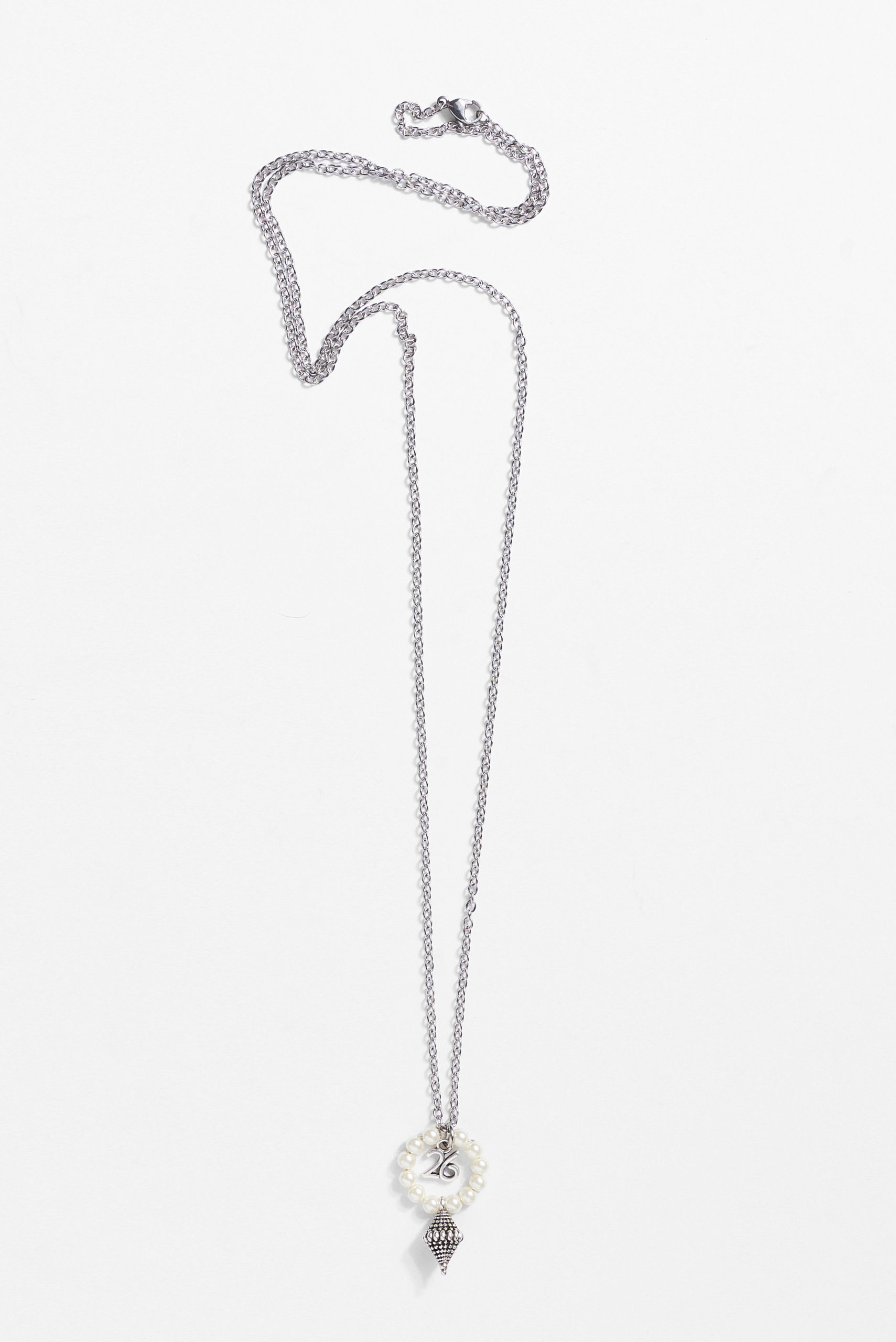 Κολιέ γούρι με ατσάλινη αλυσίδα πέρλες και επάργυρα στοιχεία, μήκος αλυσίδας 80 εκ. μοτίφ 4 εκ.