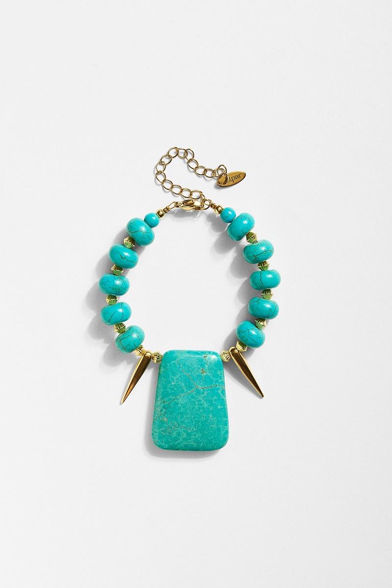 Ξεχωριστό χειροποίητο βραχιόλι με φυσικές τιρκουάζ πέτρες σε αρμονικές αποχρώσεις του γαλαζοπράσινου, εμπνευσμένο από τη φυσική ομορφιά και τη boho αισθητική. Οι στρογγυλές τιρκουάζ χάντρες δένουν ιδανικά με το εντυπωσιακό κεντρικό στοιχείο σε ορθογώνιο σχήμα, δημιουργώντας ένα κόσμημα με έντονη προσωπικότητα και καλοκαιρινό χαρακτήρα.