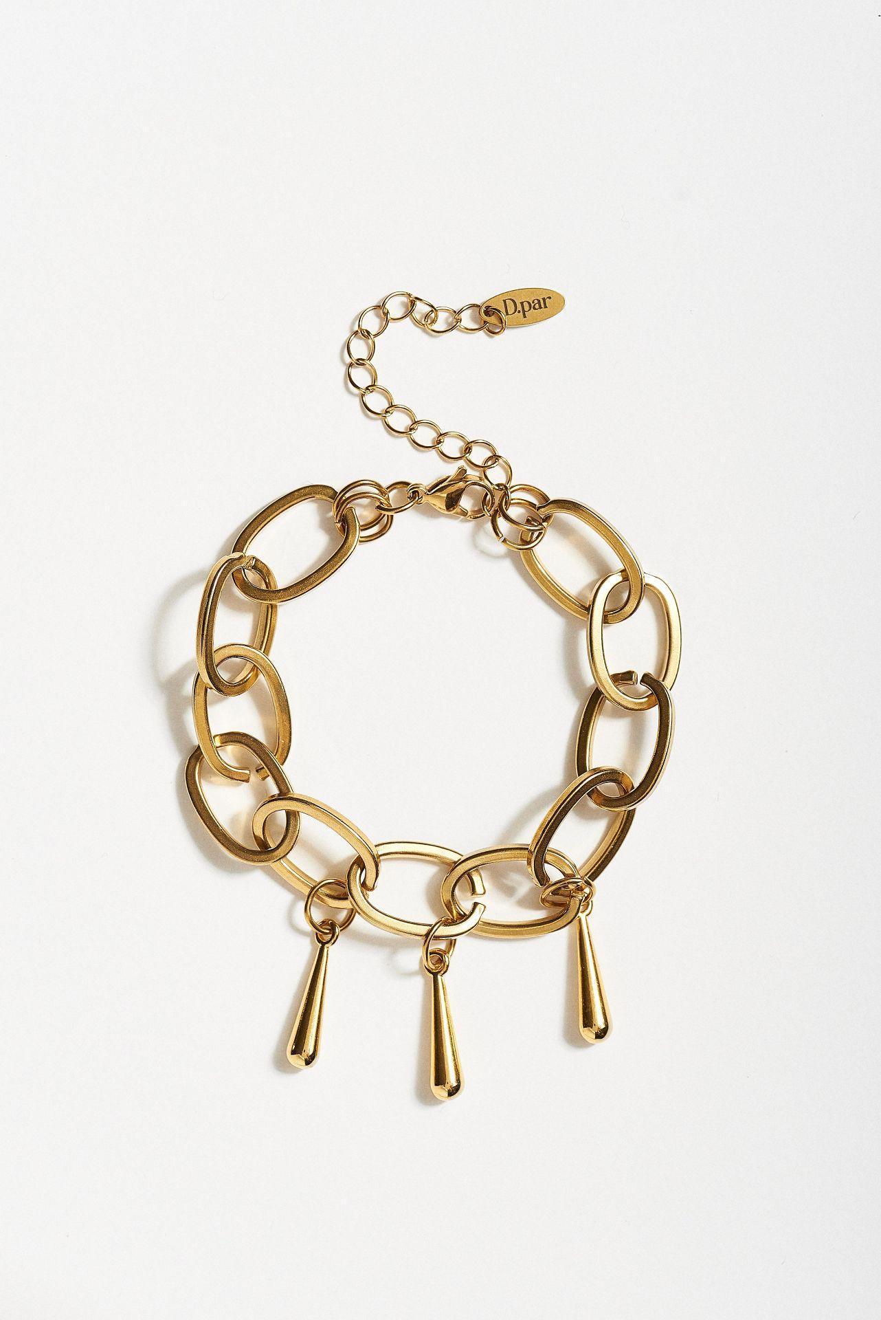 Βραχιόλι σε χρυσή απόχρωση με μεγάλους οβάλ κρίκους που δημιουργούν ένα μοντέρνο και δυναμικό σχέδιο. Στο κάτω μέρος διακοσμείται με μικρά κρεμαστά μεταλλικά στοιχεία που προσθέτουν διακριτική κίνηση και ιδιαίτερο χαρακτήρα. Διαθέτει προέκταση αλυσίδας για εύκολη ρύθμιση του μεγέθους, ώστε να προσαρμόζεται άνετα στον καρπό. Ένα κομψό αξεσουάρ που μπορεί να φορεθεί μόνο του ή σε συνδυασμό με άλλα βραχιόλια για πιο εντυπωσιακό αποτέλεσμα.