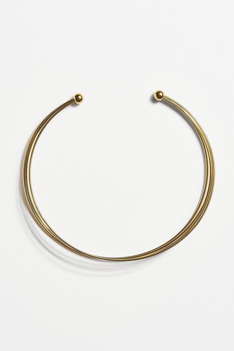 Βέργα λαιμού σε χρυσό τόνο με καθαρές γραμμές και σύγχρονη αισθητική. Ο δυναμικός, κυκλικός της σχεδιασμός αγκαλιάζει διακριτικά τον λαιμό, ενώ οι λεπτές παράλληλες μεταλλικές γραμμές προσθέτουν βάθος και κομψότητα στο κόσμημα.