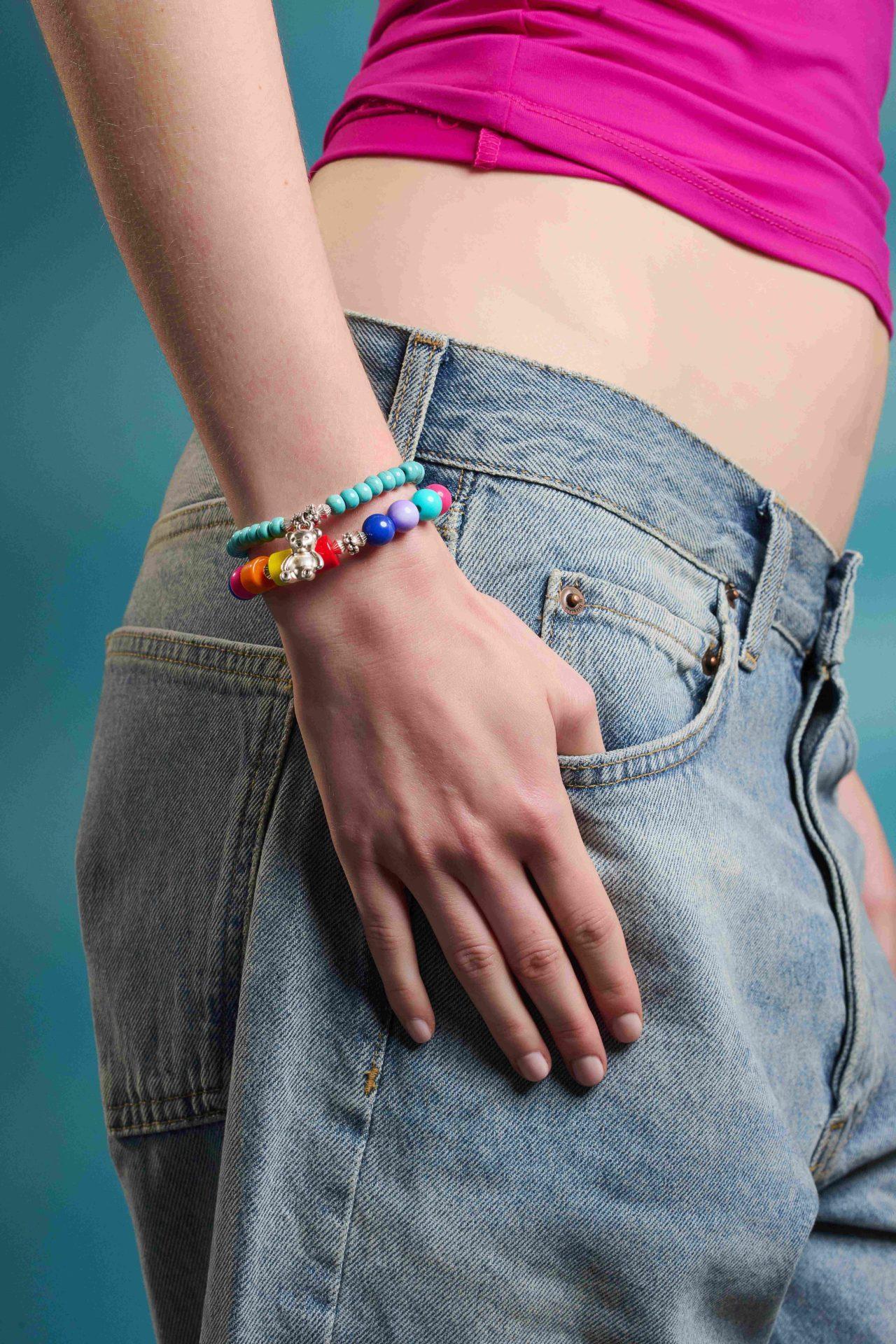Χειροποίητο διπλό βραχιόλι με τυρκουάζ χάντρες και πολύχρωμα διακοσμητικά στοιχεία που δημιουργούν έναν χαρούμενο και ιδιαίτερο συνδυασμό. Οι διαφορετικές αποχρώσεις και τα γεωμετρικά στοιχεία δίνουν στο κόσμημα μοντέρνο και παιχνιδιάρικο χαρακτήρα. Στο κέντρο ξεχωρίζει ένα χαριτωμένο μεταλλικό αρκουδάκι που προσθέτει μια γλυκιά και ξεχωριστή πινελιά. Ένα μοναδικό βραχιόλι που φοριέται εύκολα και δίνει χρώμα σε κάθε εμφάνιση.