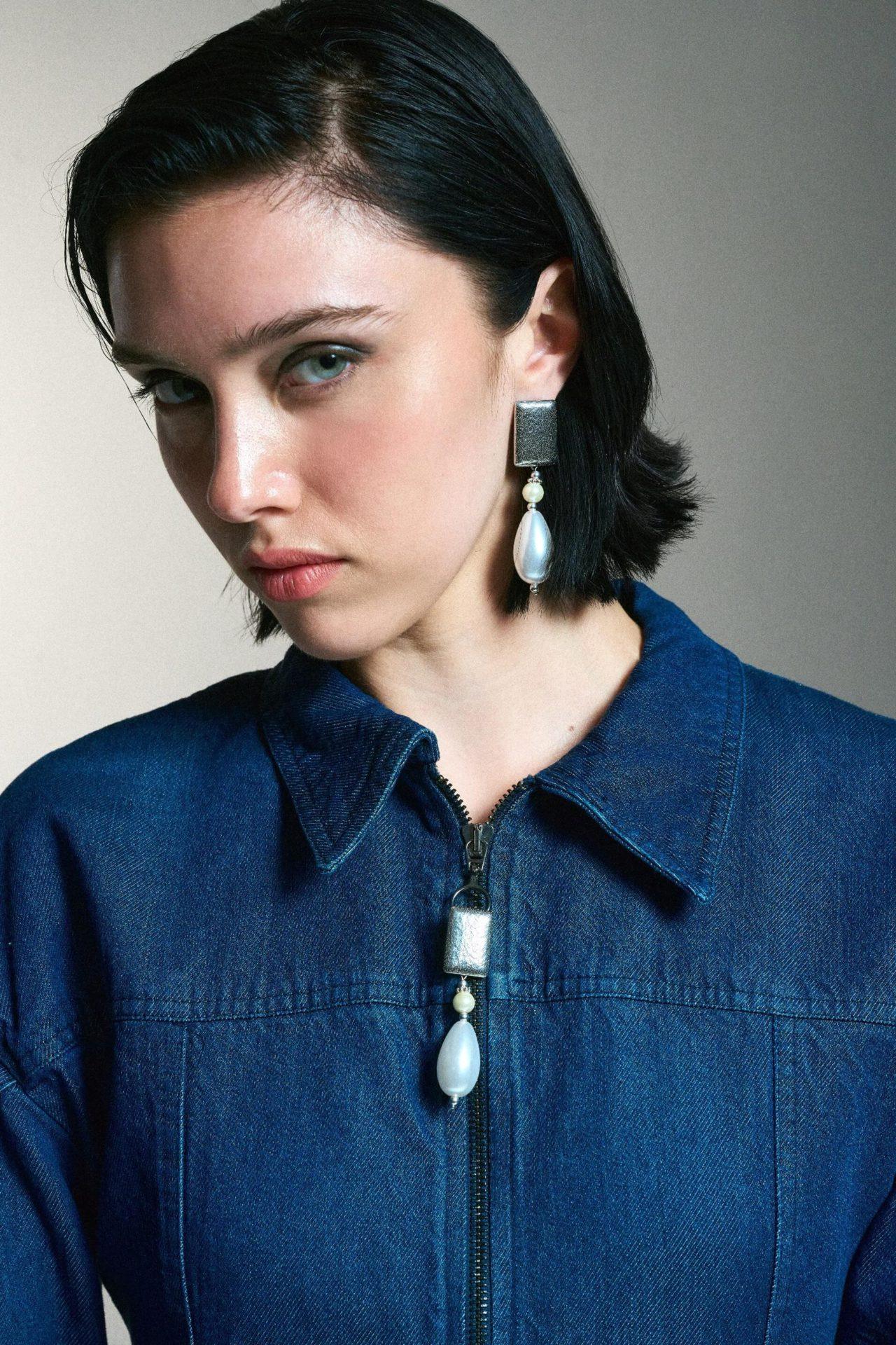Στο κάτω μέρος συνδυάζονται λευκές πέρλες σε στρογγυλή και μακρόστενη μορφή, δημιουργώντας ένα αρμονικό και θηλυκό αποτέλεσμα με απαλή κίνηση. Η καθαρότητα της πέρλας αναδεικνύει το ασημί μέταλλο και χαρίζει διαχρονική κομψότητα.