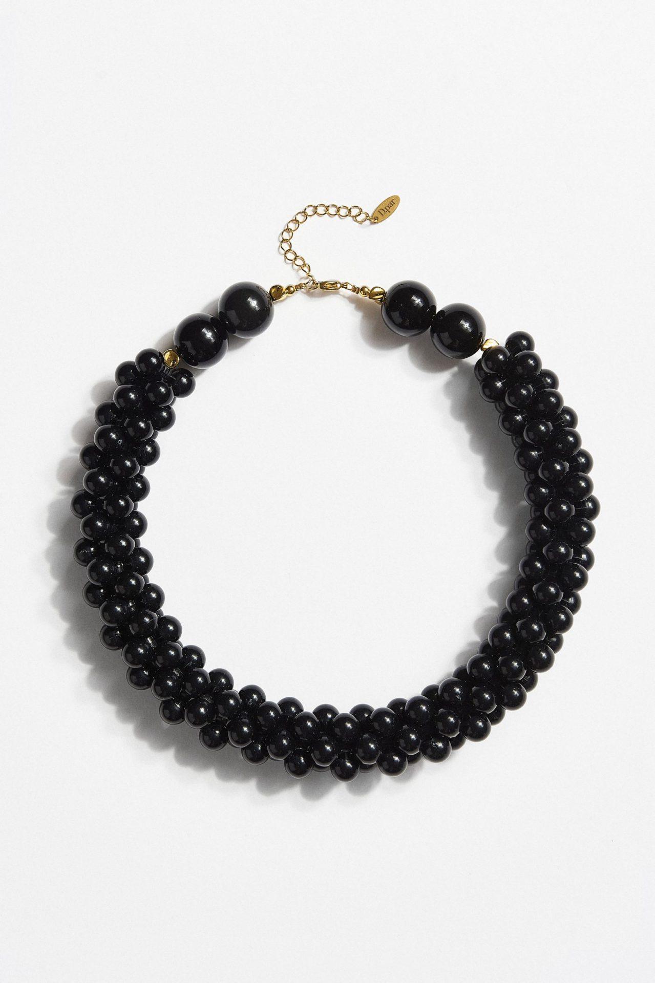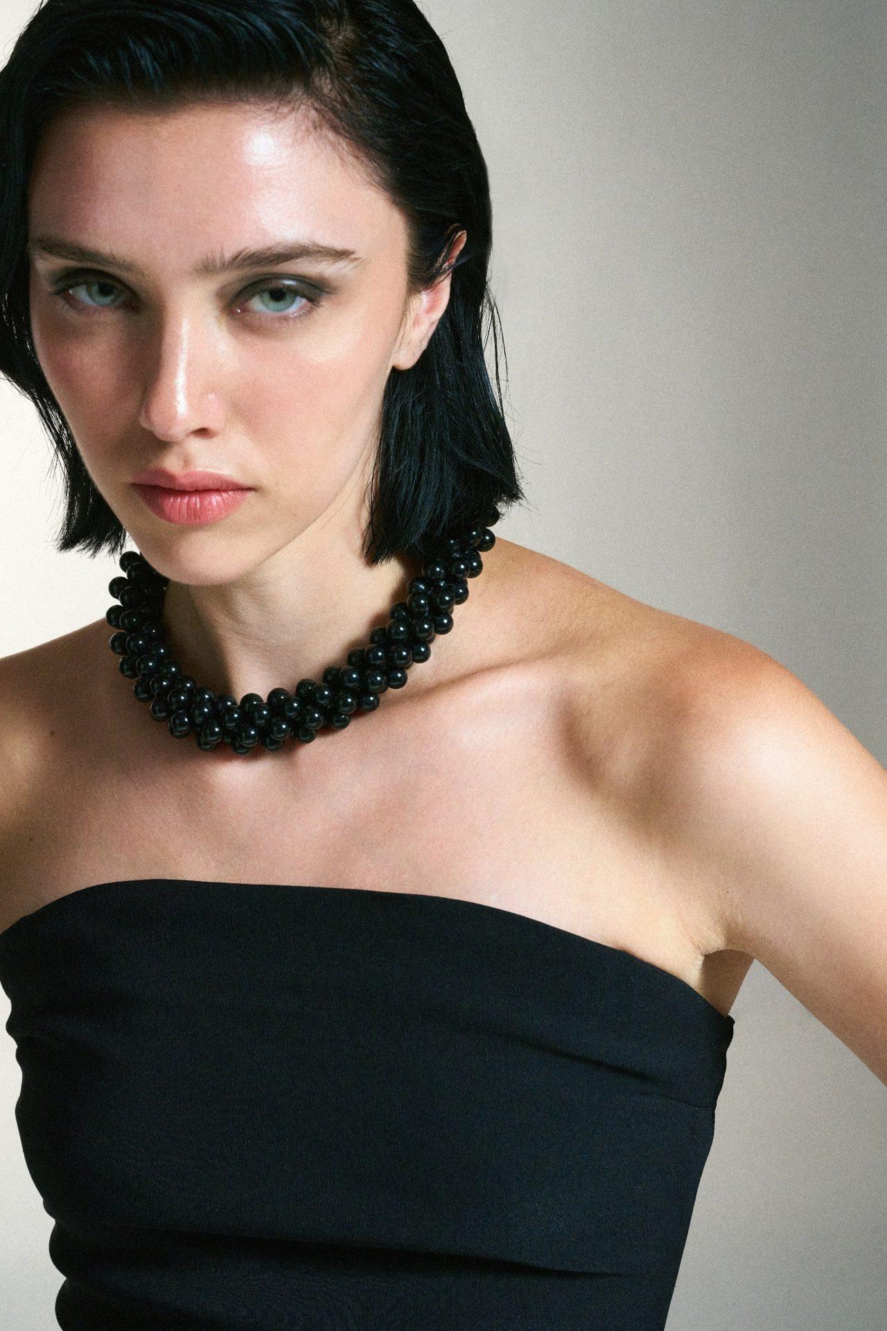 Κομψό κολιέ πολλαπλών σειρών με μικρές σφαιρικές χάντρες σε βαθύ γυαλιστερό μαύρο τόνο, που χαρίζουν έντονη λάμψη και πολυτελή αίσθηση. Η πυκνή διάταξη δημιουργεί ένα πλούσιο, γεμάτο αποτέλεσμα που αγκαλιάζει όμορφα τον λαιμό.
