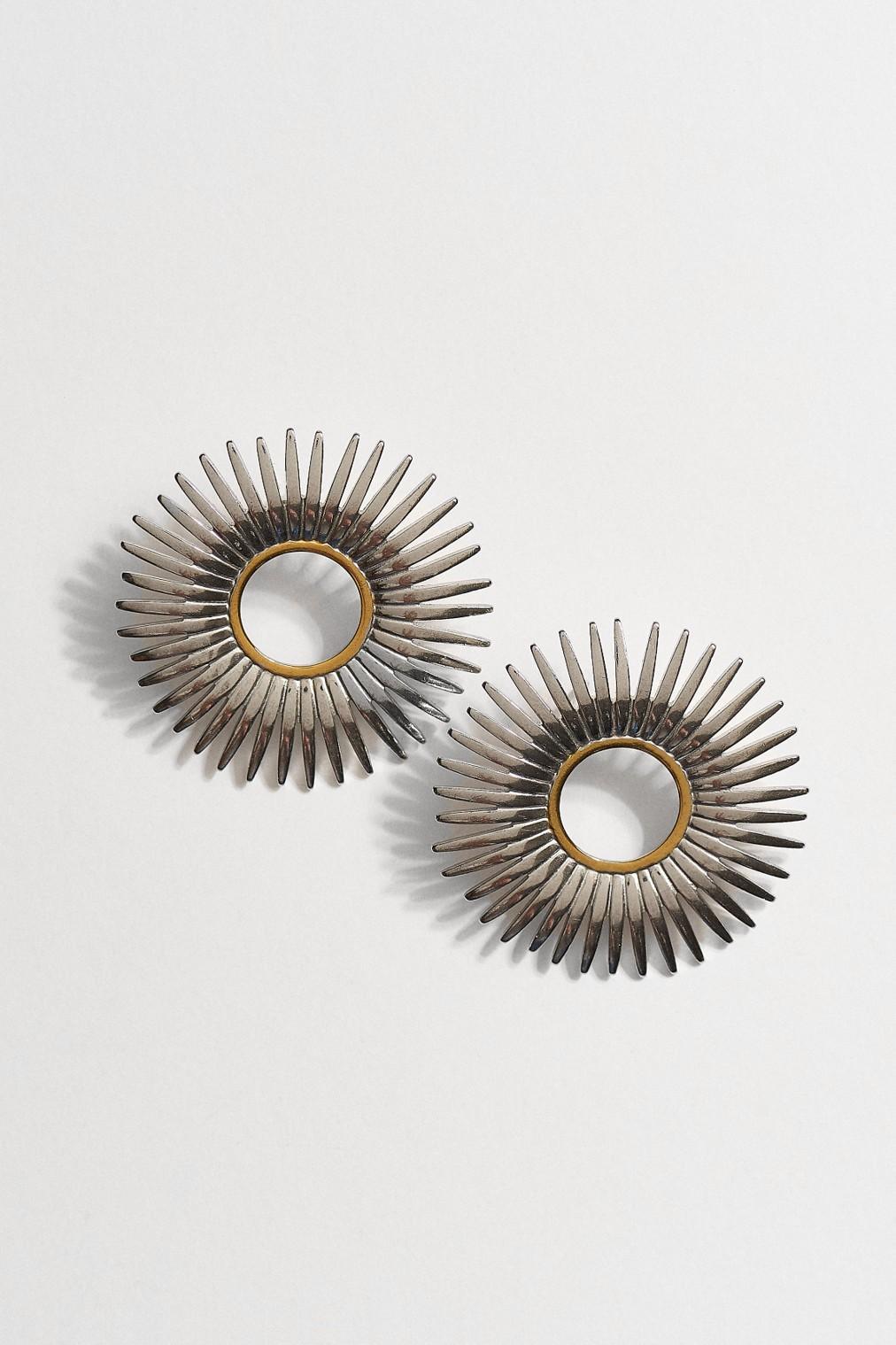 Ο κυκλικός τους σχεδιασμός με ακτινωτές λεπτομέρειες δημιουργεί ένα εντυπωσιακό εφέ “ήλιου”, συνδυάζοντας ασημί μεταλλική υφή με χρυσή εσωτερική στεφάνη για κομψή αντίθεση. Το αποτέλεσμα είναι ένα statement κόσμημα που αποπνέει σύγχρονη πολυτέλεια και διαχρονικό χαρακτήρα.