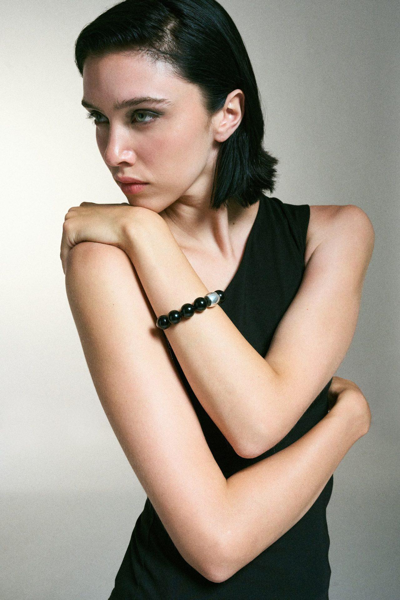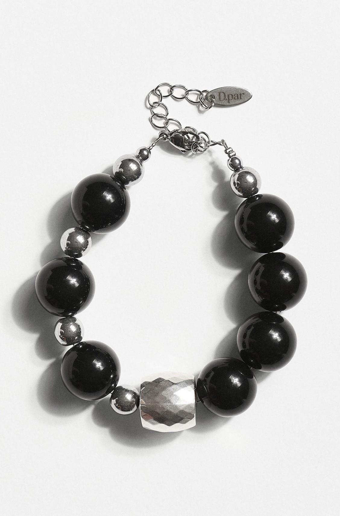 Εντυπωσιακό βραχιόλι με μεγάλες, στρογγυλές μαύρες χάντρες σε γυαλιστερό φινίρισμα που χαρίζουν βάθος και κομψότητα. Οι έντονες, καθαρές γραμμές των χαντρών δημιουργούν ένα δυναμικό και ταυτόχρονα διαχρονικό αποτέλεσμα.