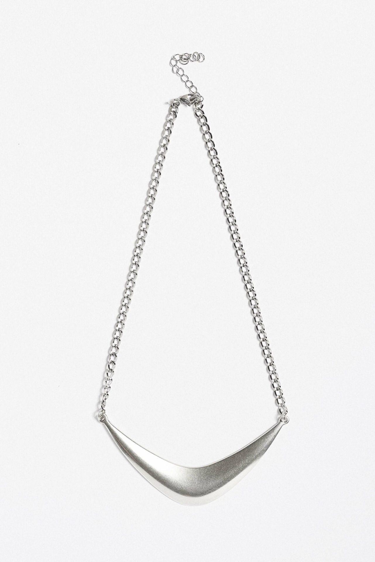 Κομψό γυναικείο κολιέ σε ασημί απόχρωση με μοντέρνα αλυσίδα και ιδιαίτερο μεταλλικό διακοσμητικό στοιχείο στο κέντρο. Ο minimal σχεδιασμός του χαρίζει κομψότητα και στυλ, κάνοντάς το ιδανικό για καθημερινές αλλά και πιο ιδιαίτερες εμφανίσεις.