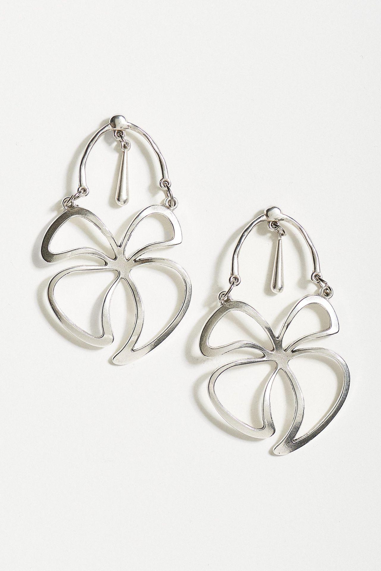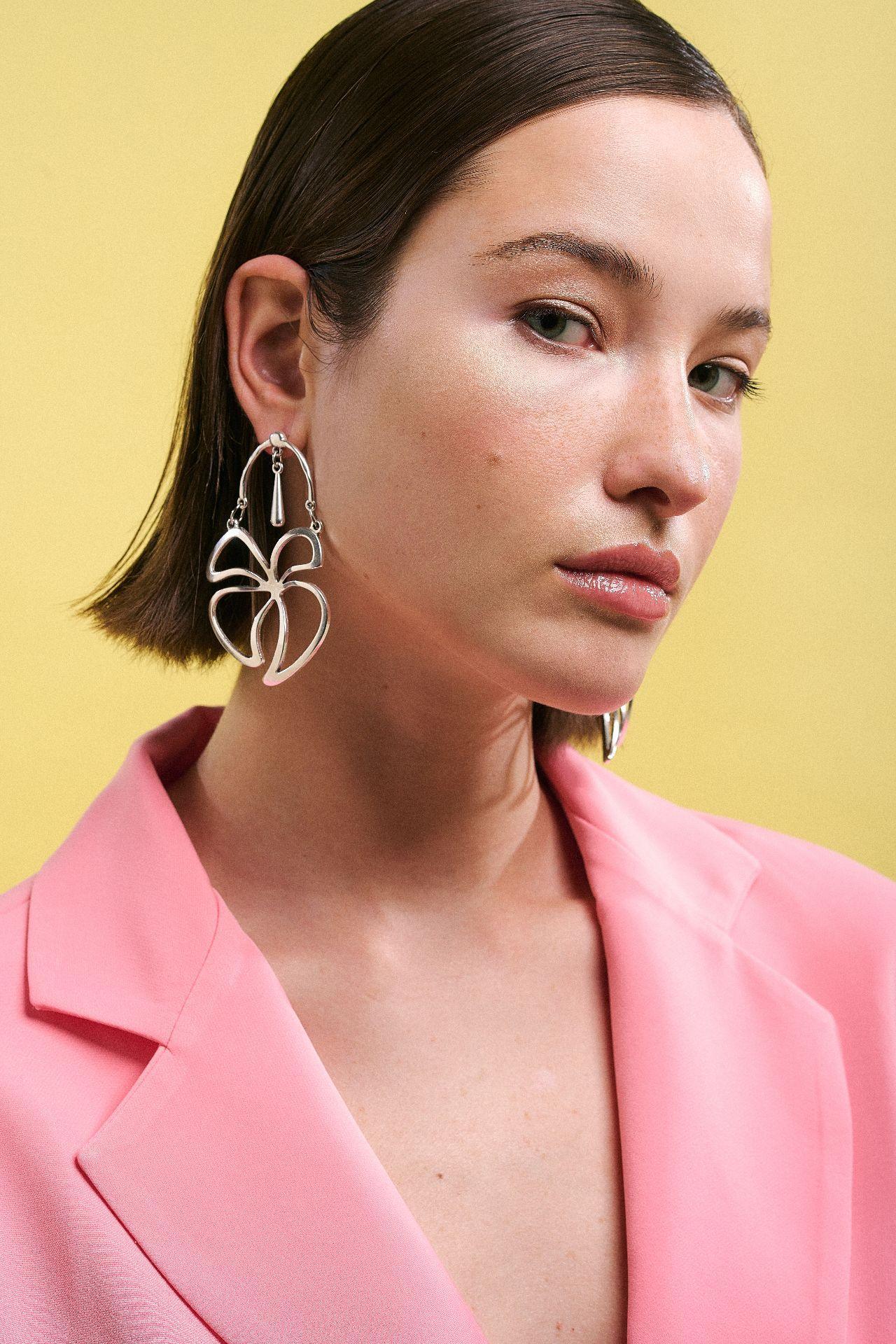 Κομψά κρεμαστά σκουλαρίκια με μοντέρνο και καλλιτεχνικό σχεδιασμό που προσθέτουν στυλ και χαρακτήρα σε κάθε εμφάνιση. Ο ανοιχτός μεταλλικός σχεδιασμός σε ασημί τόνο δημιουργεί ένα ιδιαίτερο και εντυπωσιακό αποτέλεσμα, ενώ η ελαφριά κατασκευή τους τα κάνει άνετα για καθημερινή χρήση.