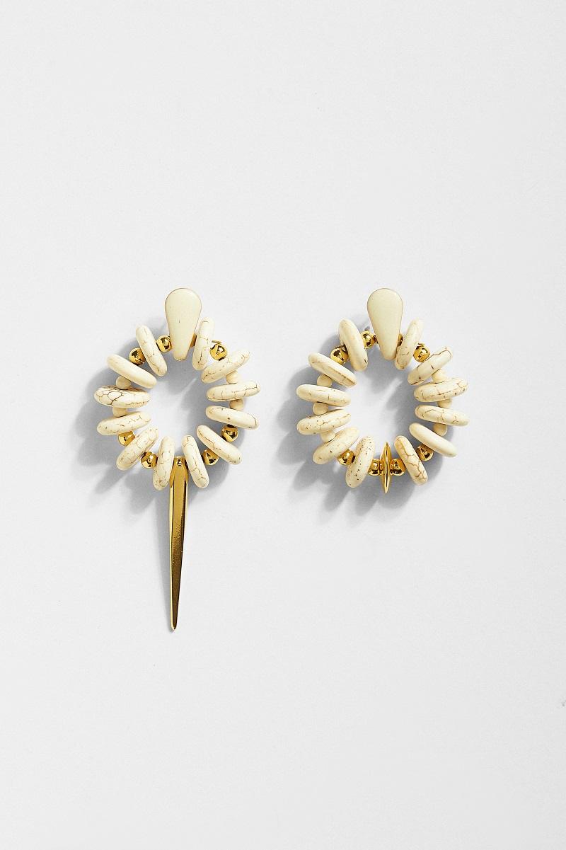 Ανακαλύψτε την απόλυτη ισορροπία ανάμεσα στη φυσική ομορφιά και το σύγχρονο design με τα σκουλαρίκια EVA. Ένα ζευγάρι που επαναπροσδιορίζει την έννοια του statement αξεσουάρ, συνδυάζοντας την οργανική υφή του ημιπολύτιμου λίθου με την αιχμηρή κομψότητα του μετάλλου. Το highlight του σχεδίου είναι η ασυμμετρία του. Μικροσκοπικές επίχρυσες μπίλιες παρεμβάλλονται ανάμεσα στις πέτρες, προσθέτοντας λάμψη και πολυτελές φινίρισμα.