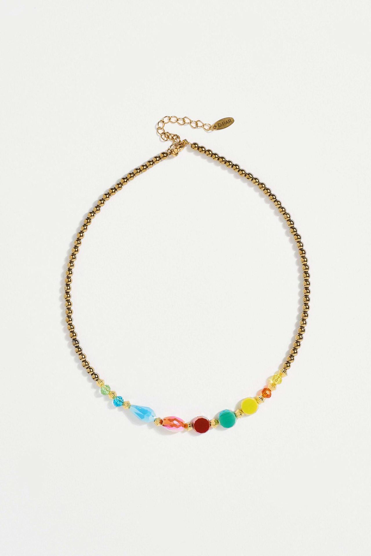 Κομψό και διακριτικό κολιέ με χρυσή αλυσίδα και μικρές πολύχρωμες χάντρες που προσθέτουν μια παιχνιδιάρικη και καλοκαιρινή πινελιά στο κόσμημα. Οι διαφορετικές αποχρώσεις των χαντρών δημιουργούν έναν όμορφο και αρμονικό συνδυασμό χρωμάτων που φωτίζει κάθε εμφάνιση.