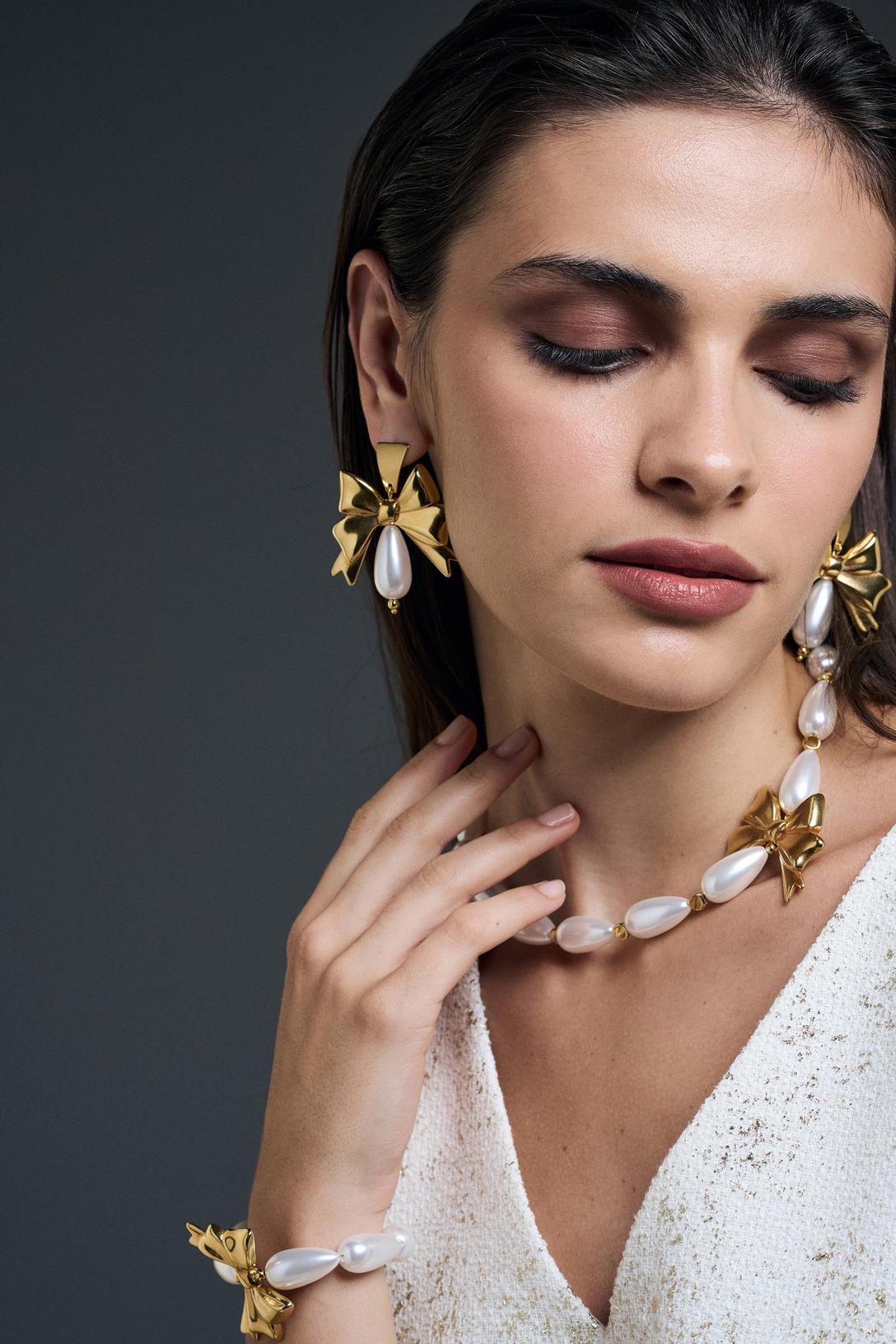Κομψά σκουλαρίκια σε χρυσό τόνο με εντυπωσιακό σχέδιο φιόγκου που αποπνέει ρομαντισμό και διαχρονική κομψότητα. Η κρεμαστή πέρλα στο τελείωμα προσθέτει μια φίνα και πολυτελή πινελιά, δημιουργώντας ένα κόσμημα που ξεχωρίζει.