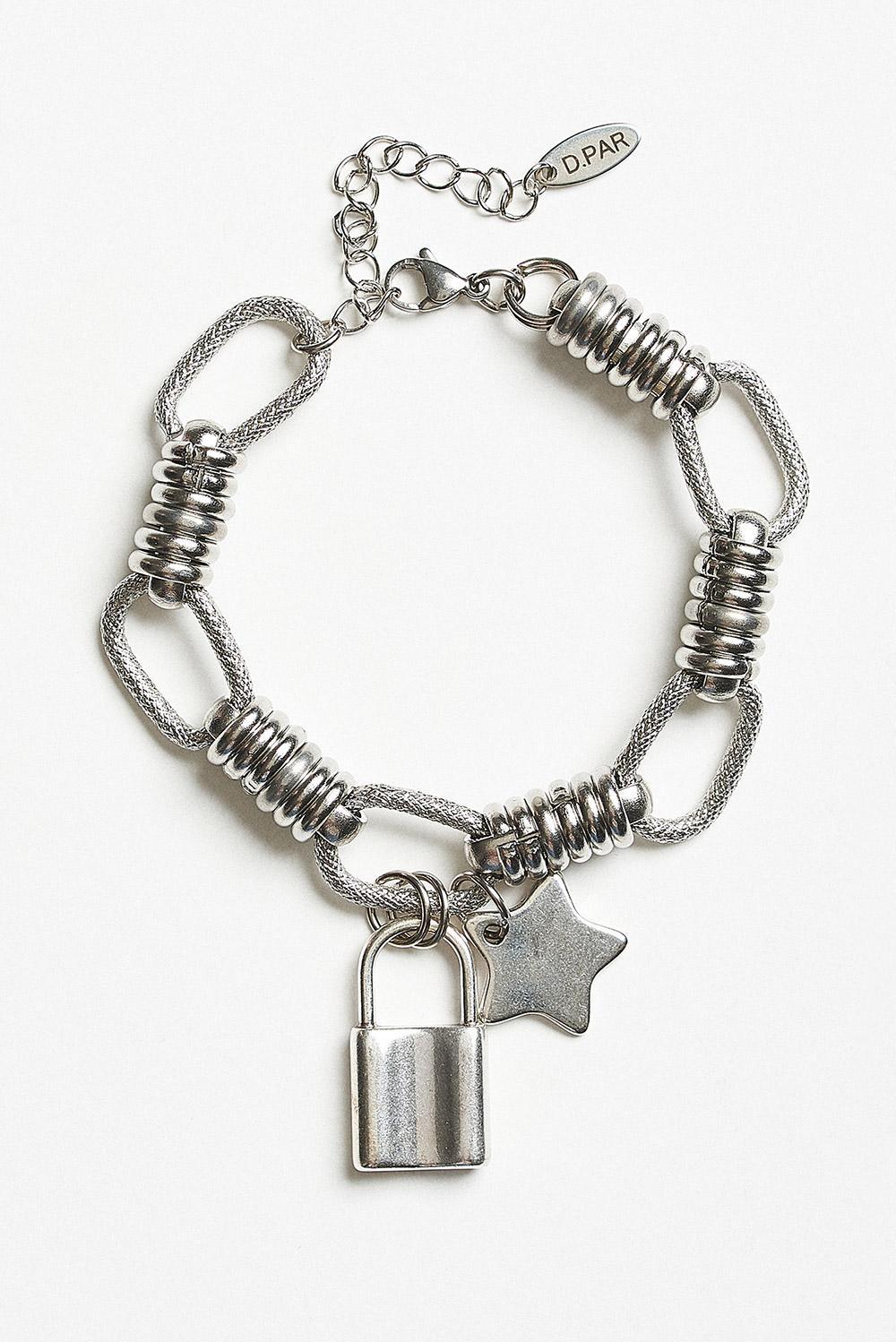 Βραχιόλι σε ασημί απόχρωση με ιδιαίτερο σχέδιο από μεταλλικούς κρίκους και διακοσμητικά στοιχεία που δημιουργούν ένα μοντέρνο και δυναμικό αποτέλεσμα. Στο κέντρο ξεχωρίζουν τα κρεμαστά charms σε σχήμα λουκέτου και αστεριού, που προσθέτουν χαρακτήρα και μια παιχνιδιάρικη πινελιά στο κόσμημα. Διαθέτει προέκταση αλυσίδας για ρύθμιση του μεγέθους και άνετη εφαρμογή στον καρπό. Ένα εντυπωσιακό αξεσουάρ που συμπληρώνει εύκολα κάθε σύγχρονο look.