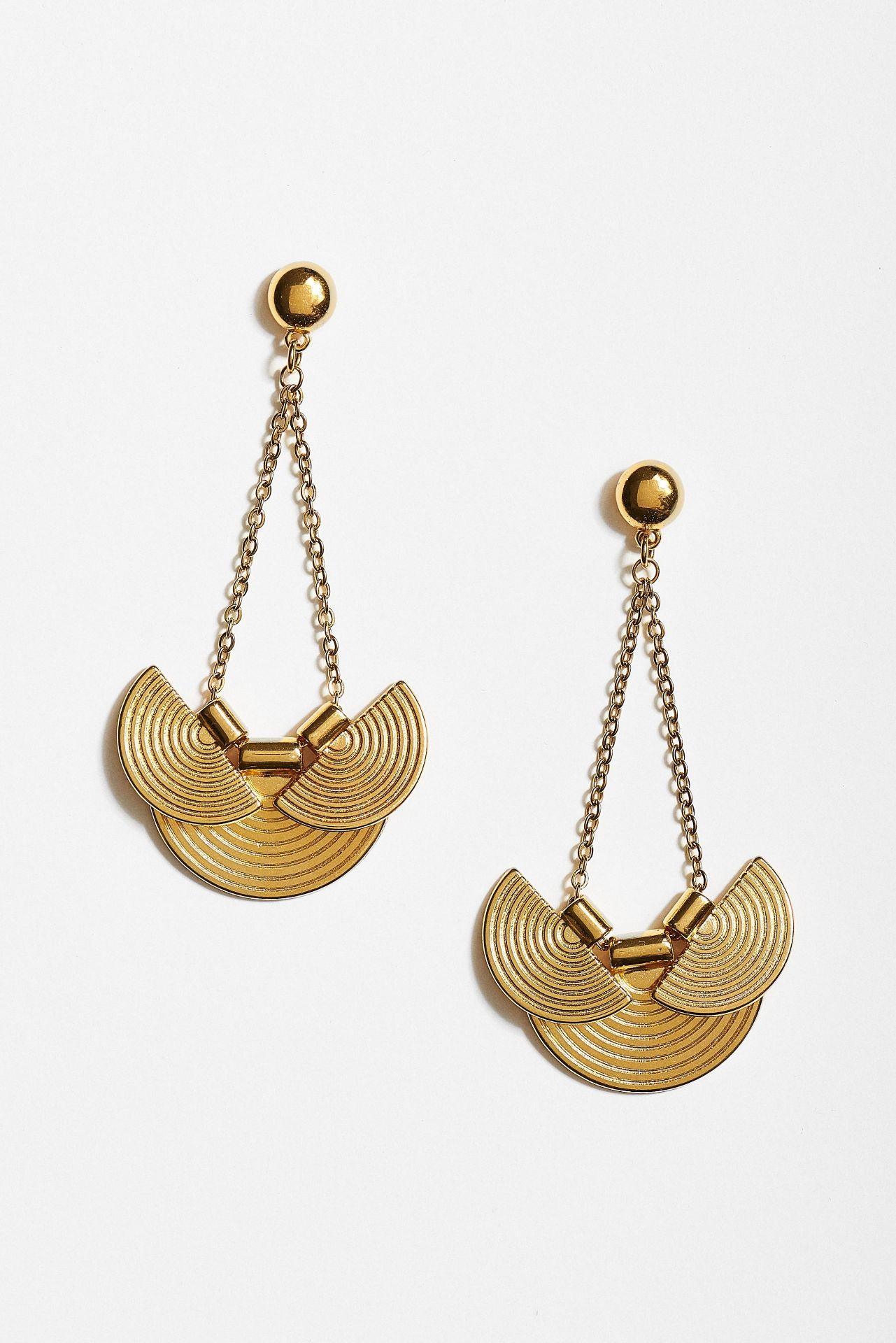 Κρεμαστά σκουλαρίκια σε χρυσή απόχρωση με ιδιαίτερο γεωμετρικό σχεδιασμό. Οι λεπτές αλυσίδες ενώνουν το επάνω στρογγυλό κούμπωμα με το διακοσμητικό στοιχείο που αποτελείται από ημικυκλικά μεταλλικά μέρη με χαραγμένες γραμμές. Το σχέδιο δημιουργεί κομψή κίνηση και δίνει ένα μοντέρνο αλλά και ξεχωριστό ύφος στο κόσμημα, ιδανικό για εμφανίσεις που θέλουν μια ιδιαίτερη πινελιά