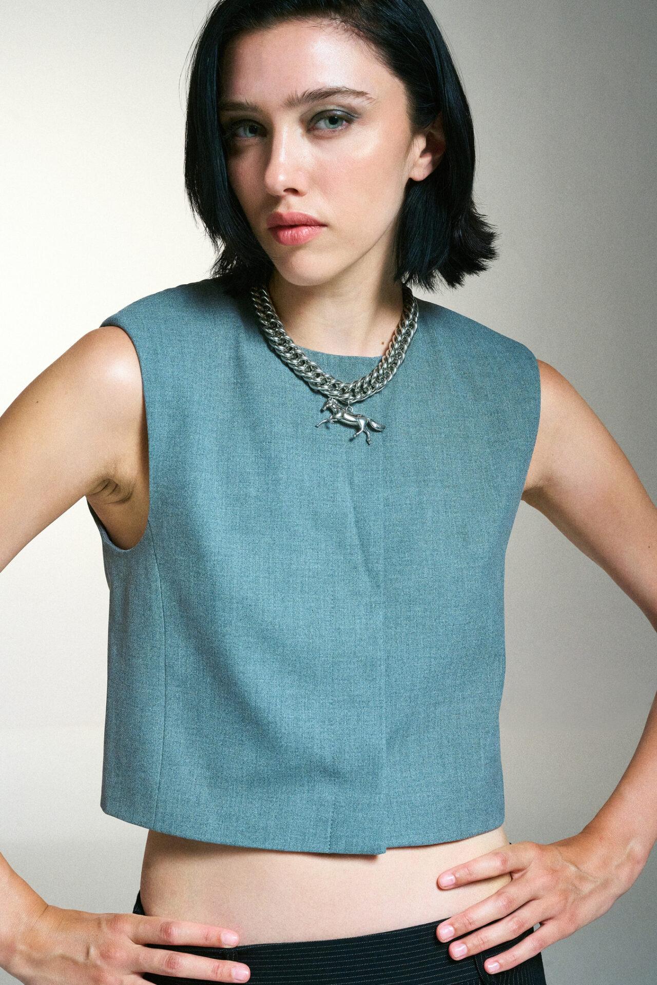 Εντυπωσιακό κολιέ με πλεκτή, chunky ασημί αλυσίδα που αγκαλιάζει τον λαιμό και ολοκληρώνεται με κρεμαστό στοιχείο σε σχήμα αλόγου. Ο δυναμικός σχεδιασμός του αποπνέει δύναμη, ελευθερία και κομψότητα, δημιουργώντας ένα ξεχωριστό statement κόσμημα.