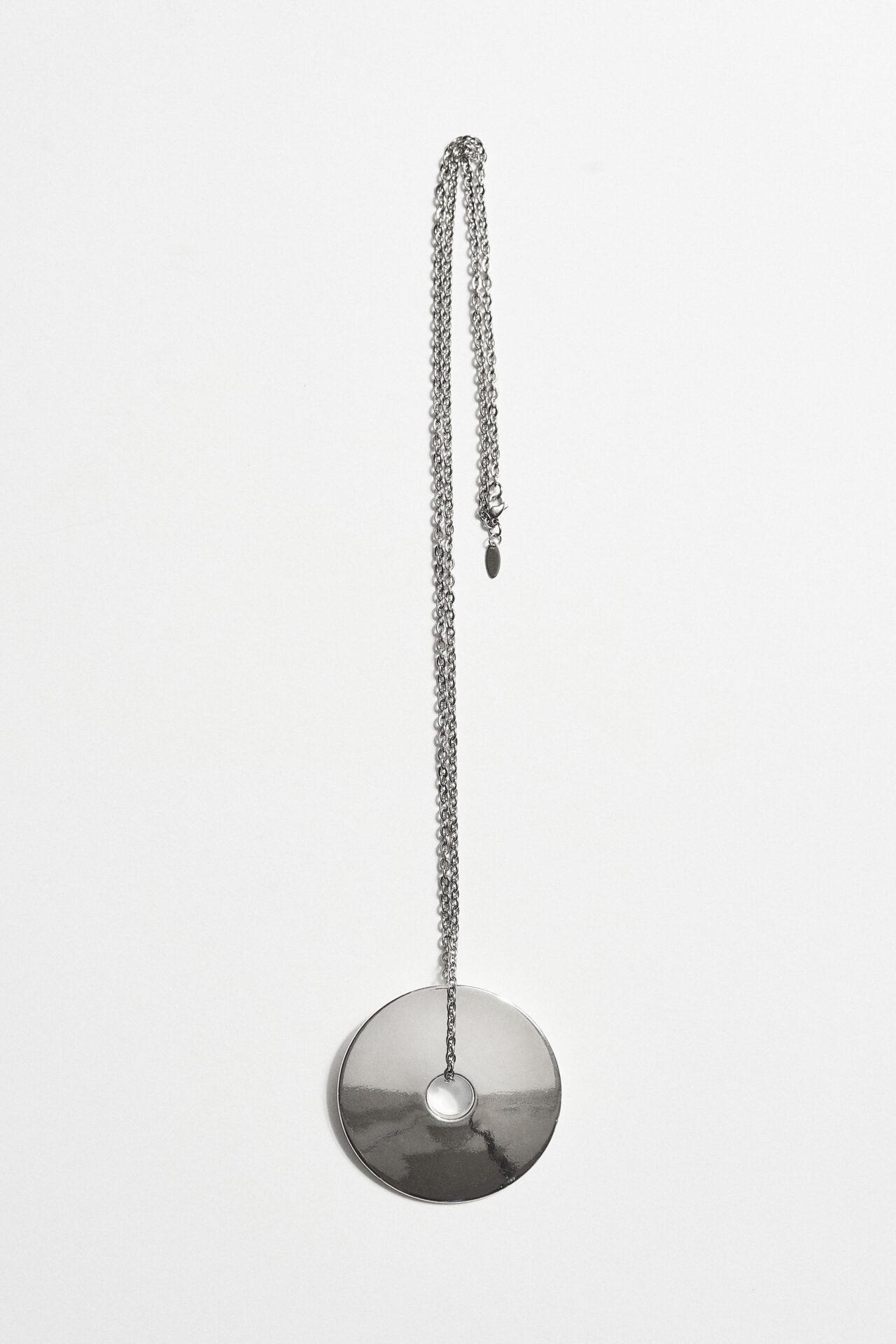 Εντυπωσιακό μακρύ κολιέ με μεγάλο στρογγυλό μεταλλικό στοιχείο που κλέβει τις εντυπώσεις. Ο δυναμικός, γεωμετρικός του σχεδιασμός προσδίδει σύγχρονο χαρακτήρα και κάνει το κόσμημα να ξεχωρίζει σε κάθε εμφάνιση.