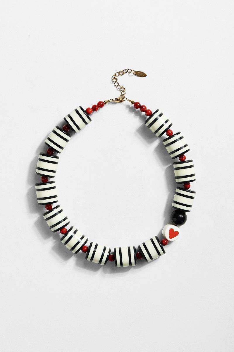 Χειροποίητο κολιέ με ιδιαίτερη ασπρόμαυρη γεωμετρική αισθητική και κόκκινες λεπτομέρειες που τραβούν το βλέμμα. Αποτελείται από επίπεδες χάντρες σε εναλλαγή μαύρου και λευκού, δεμένες με μικρές κόκκινες χάντρες, ενώ η καρδιά-λεπτομέρεια προσθέτει μια παιχνιδιάρικη και ρομαντική πινελιά.