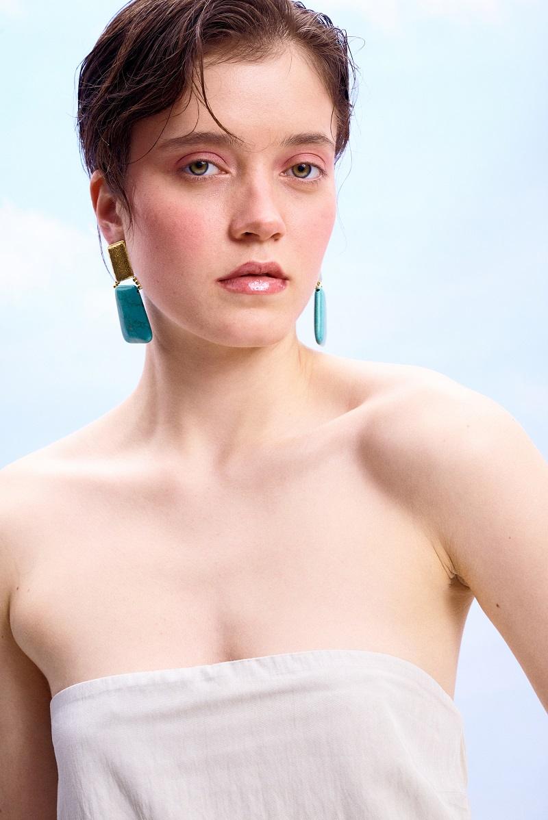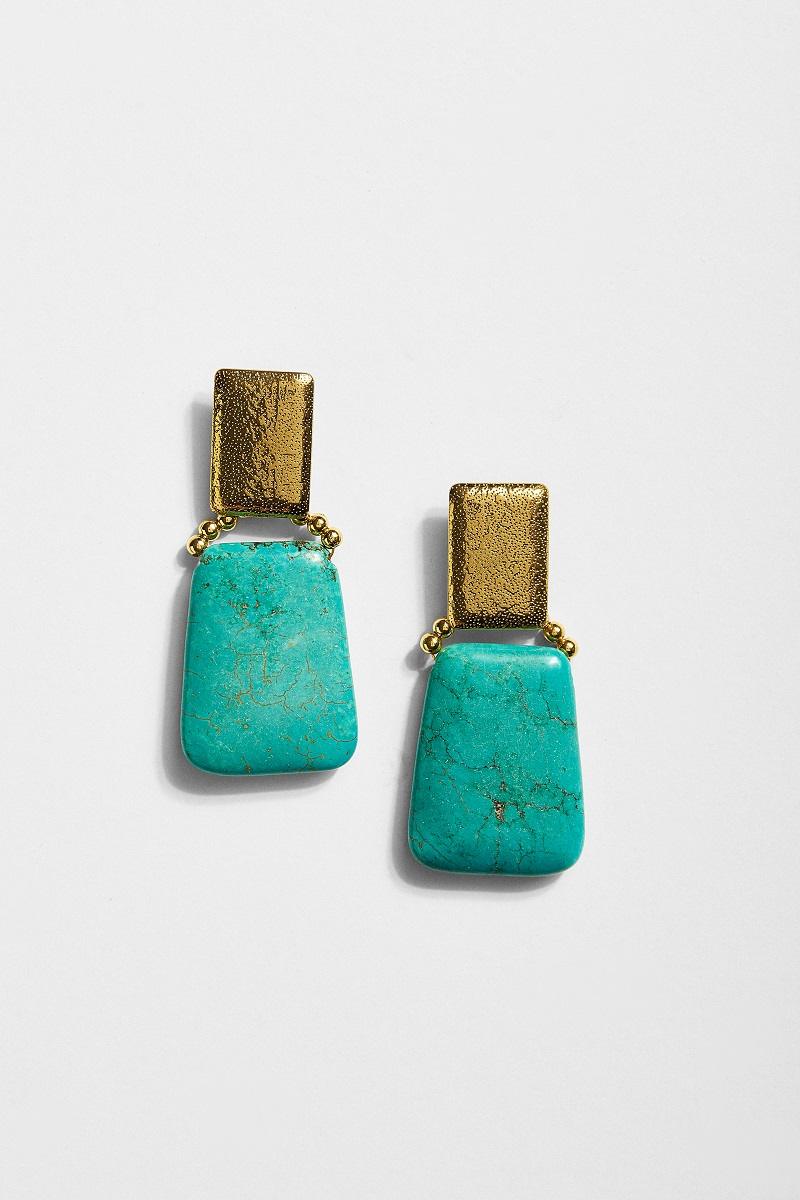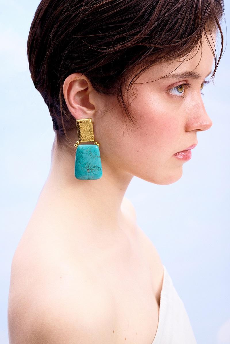 Προσθέστε μια πινελιά διαχρονικής κομψότητας στην εμφάνισή σας με αυτά τα ιδιαίτερα σκουλαρίκια. Ο συνδυασμός της τραχιάς χρυσής υφής στο επάνω μέρος με την λεία, φυσική όψη της τιρκουάζ πέτρας δημιουργεί μια εντυπωσιακή αντίθεση. Το γεωμετρικό τους σχήμα αποπνέει έναν σύγχρονο αέρα, ενώ το έντονο χρώμα της πέτρας θυμίζει καλοκαίρι και φρεσκάδα.