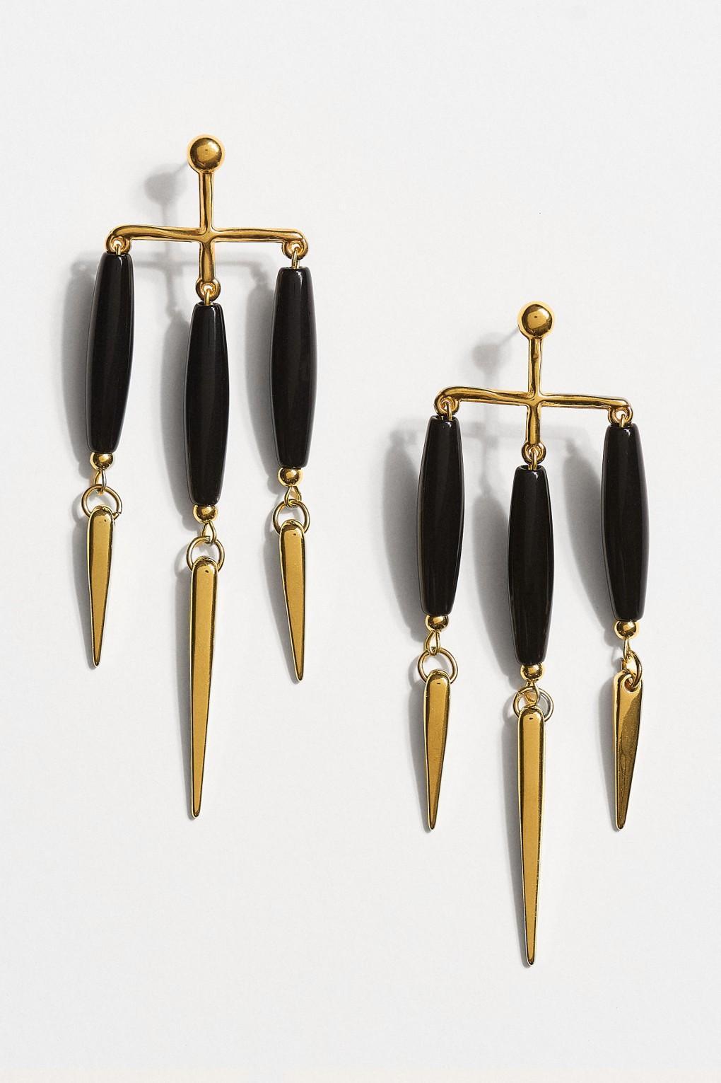Εντυπωσιακά κρεμαστά σκουλαρίκια σε συνδυασμό μαύρου και χρυσού τόνου, με γεωμετρικό και δυναμικό σχεδιασμό. Στο επάνω μέρος διαθέτουν στρογγυλή μπίλια και οριζόντιο μεταλλικό στοιχείο από το οποίο κρέμονται επιμήκη μαύρα στοιχεία, δημιουργώντας κίνηση και κομψή ισορροπία.