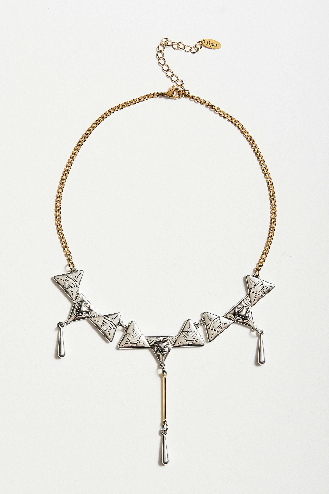 Κομψό κολιέ με μοντέρνο γεωμετρικό σχεδιασμό που ξεχωρίζει για τα ιδιαίτερα μεταλλικά στοιχεία σε σχήμα τριγώνων. Ο συνδυασμός της χρυσής αλυσίδας με τα ασημί γεωμετρικά μοτίβα δημιουργεί ένα εντυπωσιακό κόσμημα με σύγχρονη αισθητική και μοναδικό χαρακτήρα.