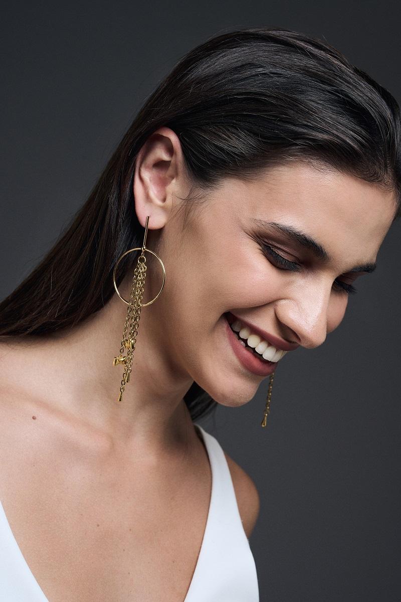 Modern asymmetrical earrings that stand out for their distinctive design. The gold hoop is combined with delicate chains that add movement and elegance, while the small bow details introduce a playful and feminine touch.