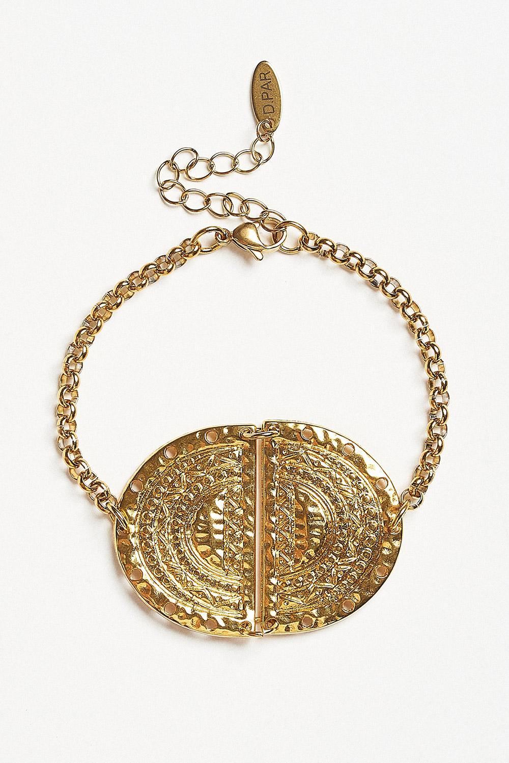 Κομψό βραχιόλι σε χρυσή απόχρωση με ιδιαίτερο διακοσμητικό στοιχείο στο κέντρο. Το εντυπωσιακό οβάλ μεταλλικό μοτίβο με περίτεχνη υφή χαρίζει μοναδικό χαρακτήρα και ξεχωριστό στυλ στο κόσμημα.