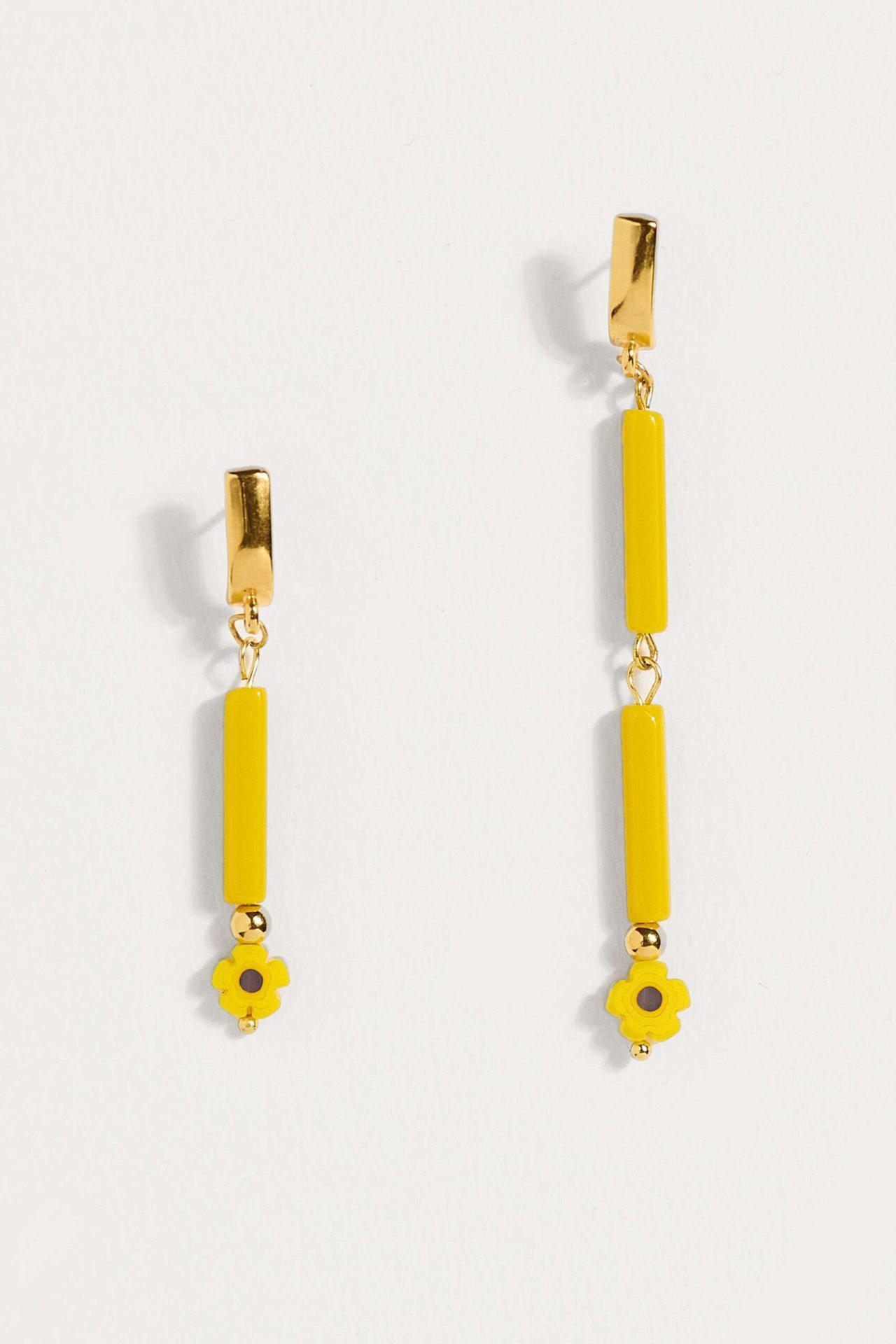 Ασύμμετρα σκουλαρίκια σε έντονη κίτρινη απόχρωση που χαρίζουν μοντέρνο και παιχνιδιάρικο στυλ. Το ένα σκουλαρίκι έχει πιο μακρύ σχέδιο, δημιουργώντας ένα ιδιαίτερο ασύμμετρο αποτέλεσμα. Διακοσμούνται με μακρόστενα στοιχεία και μικρό λουλούδι στο τελείωμα, που προσθέτει μια χαριτωμένη και καλοκαιρινή πινελιά. Ιδανικά για να δώσουν χρώμα και χαρακτήρα σε κάθε εμφάνιση.