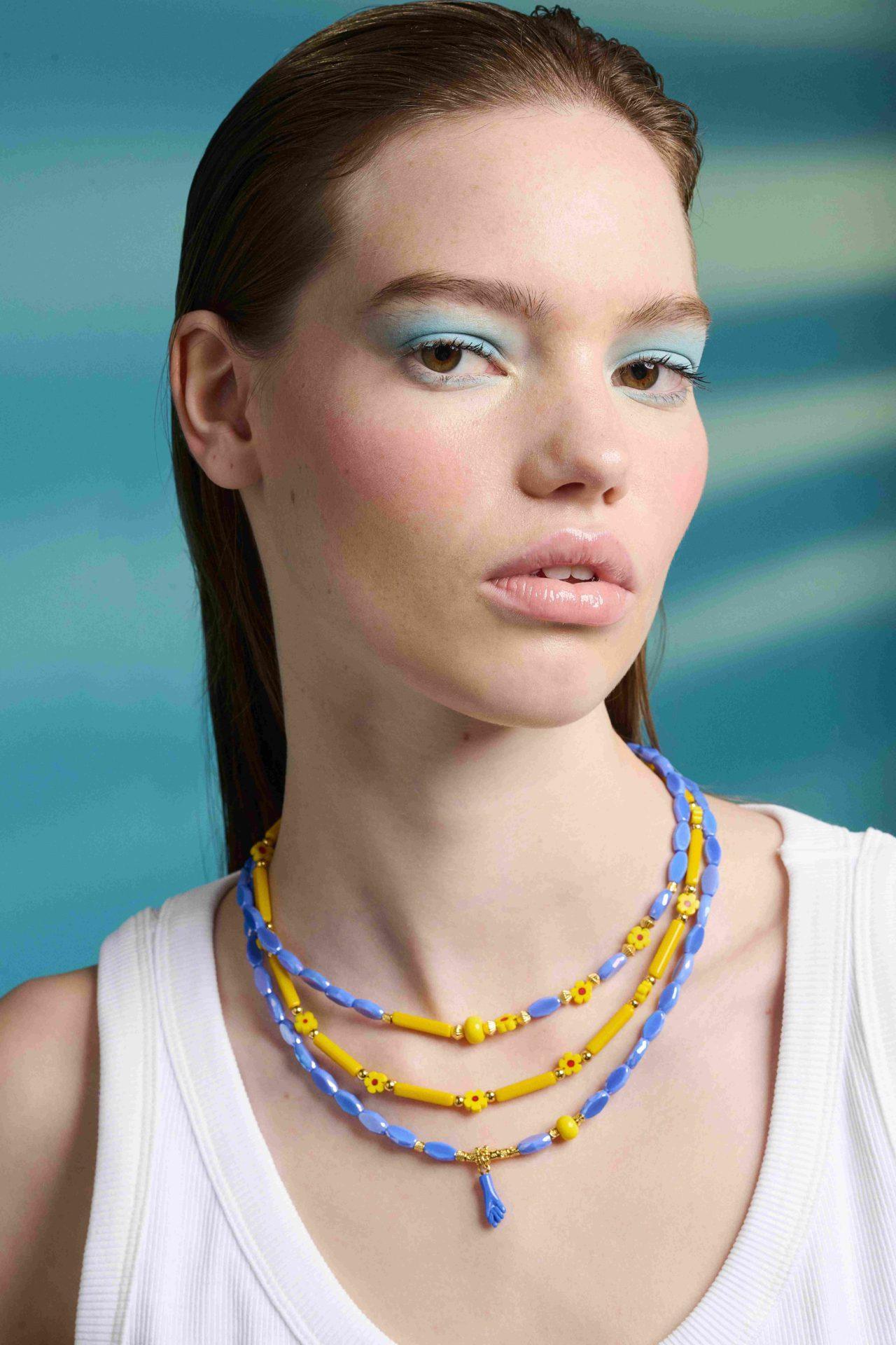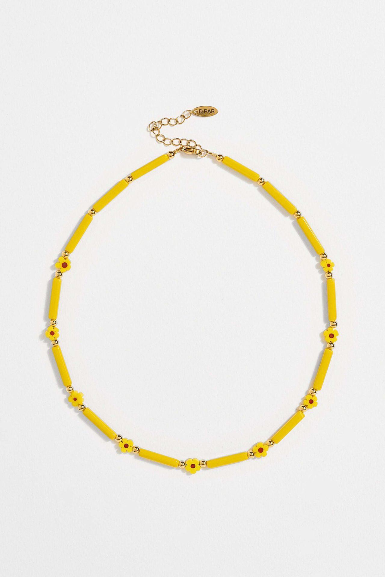 Ένα παιχνιδιάρικο και χαρούμενο κολιέ που αποπνέει καλοκαιρινή διάθεση. Οι επιμήκεις κίτρινες χάντρες συνδυάζονται αρμονικά με μικρά λουλουδάκια δημιουργώντας ένα ιδιαίτερο και φωτεινό σχέδιο που ξεχωρίζει.