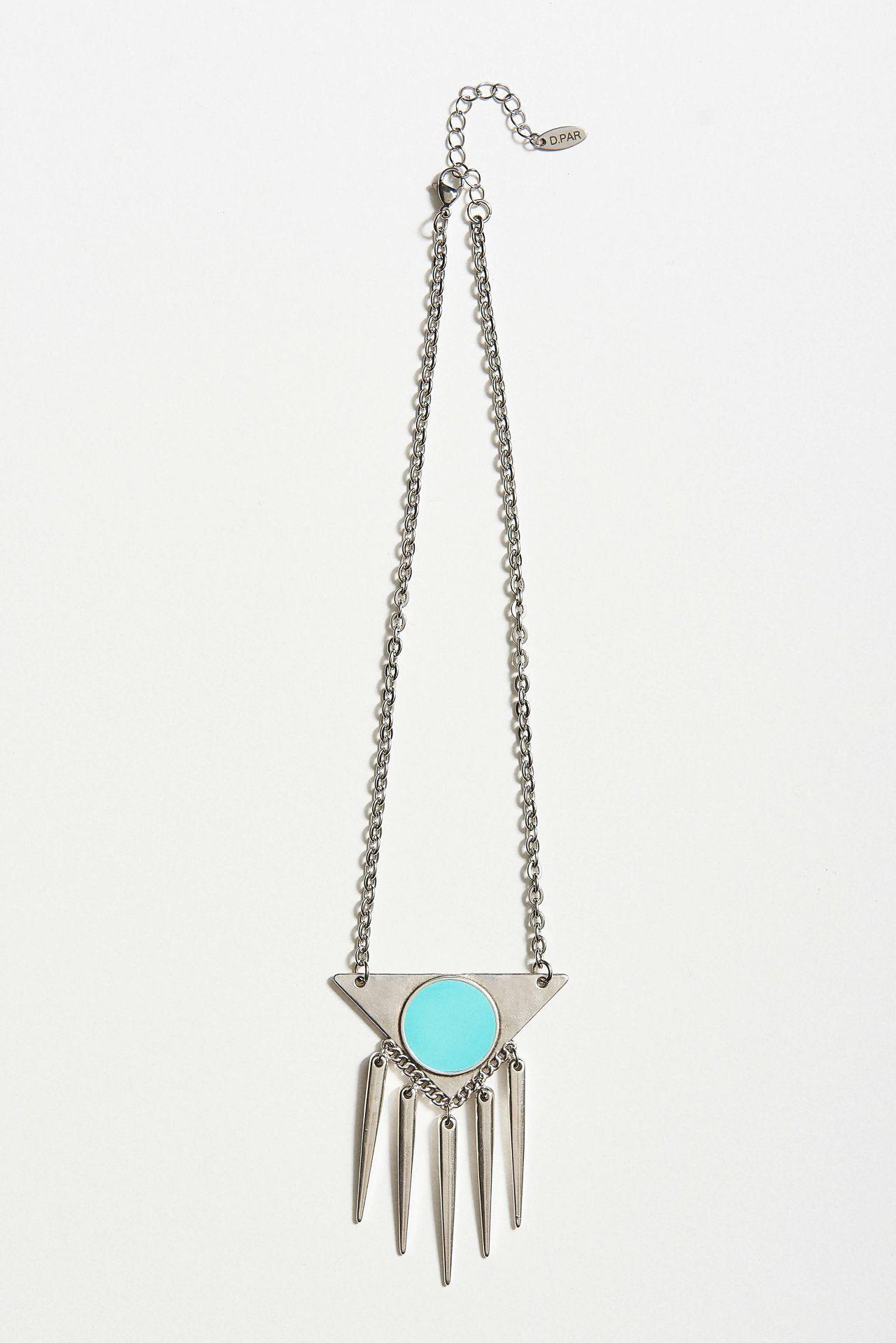 Eye-catching necklace with a silver-tone metal chain, designed in a modern geometric style that draws attention. At the center of the piece lies a triangular metal element in a silver finish, framing a round element in a vivid turquoise color. The contrast between the silver metal and the bright turquoise creates a highly elegant and dynamic effect.