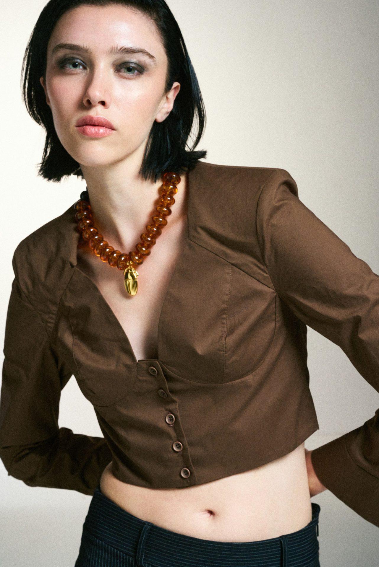 Στο επάνω μέρος, το κολιέ ολοκληρώνεται με στρογγυλές χάντρες σε μαύρο και καφέ τόνους, δημιουργώντας μία αρμονική αντίθεση με τις μελί αποχρώσεις. Το κούμπωμα διαθέτει αλυσίδα προέκτασης σε χρυσό τόνο για ρυθμιζόμενο μήκος και άνετη εφαρμογή.