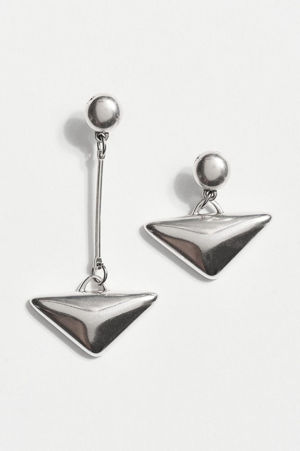 Ασύμμετρα σκουλαρίκια σε ασημί τόνο με καθαρές, γεωμετρικές γραμμές και σύγχρονη αισθητική. Στο επάνω μέρος διαθέτουν στρογγυλή μπίλια που εφαρμόζει διακριτικά στο αυτί, ενώ το κάτω μέρος καταλήγει σε τριγωνικό, πυραμιδοειδές μεταλλικό στοιχείο με λείες, γυαλιστερές επιφάνειες που αντανακλούν το φως.